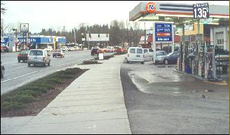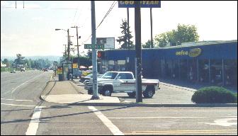 54' To sidewalk edge Union 76 Gas Station at River Road This new sidewalk and landscape strip is less than two years old. The BRT plan will widen McLoughlin to at least 60' at this point. This will destroy this business. See more samples below |